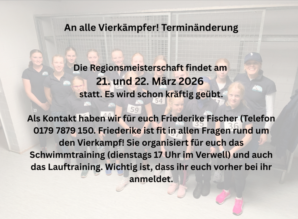 Als Kontakt haben wir für euch Friederike Fischer (Telefon 0179 7879 150. Friederike ist fit in allen Fragen rund um den Vierkampf! Sie organisiert für euch das Schwimmtraining (dienstags 17 Uhr im Verwell) und auch das Lauftraining. Wichtig ist, dass ihr euch vorher bei ihr anmeldet.