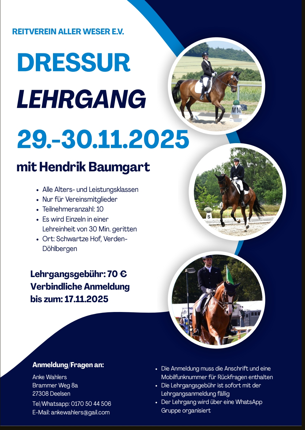 Wir freuen uns sehr, euch herzlich zu einem Dressurlehrgang mit Hendrik Baumgart einzuladen.